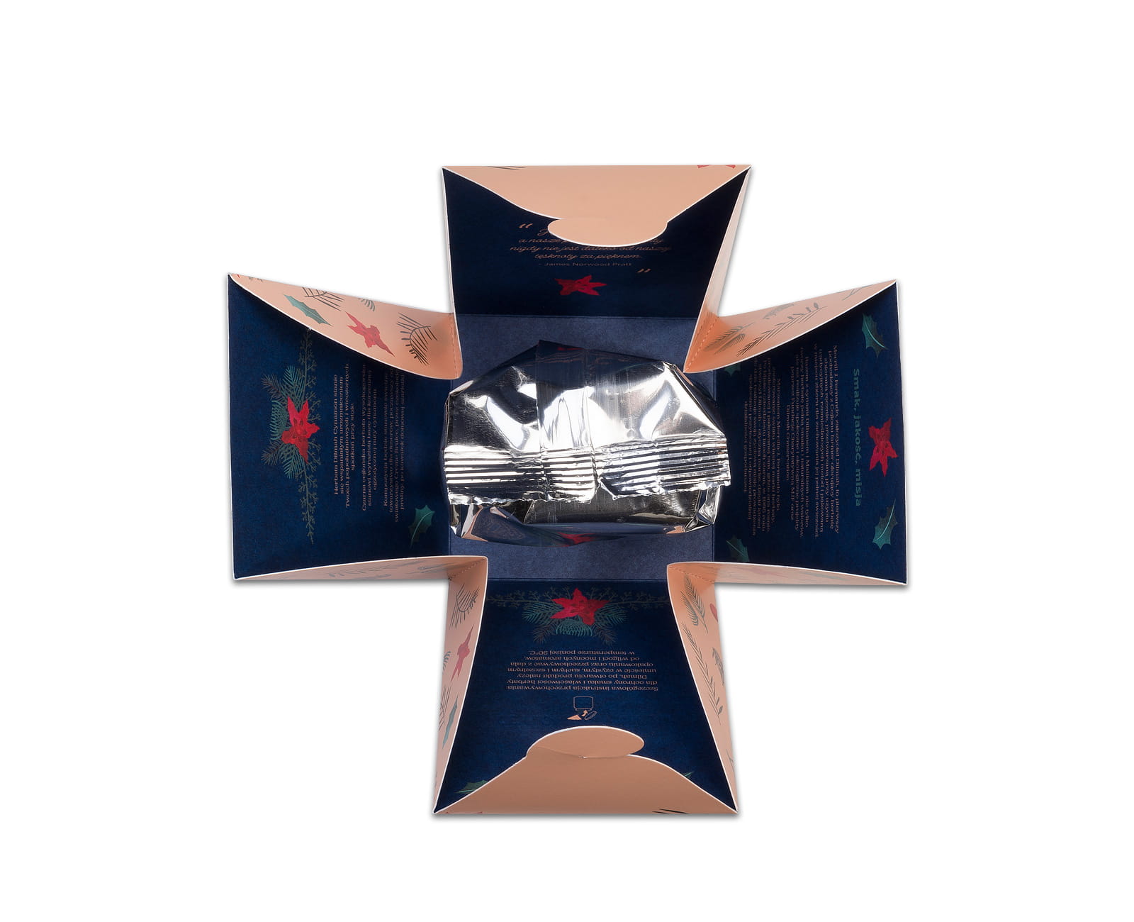 Stylowe, tłoczone opakowanie w świątecznej kolorystyce czyni ją pięknym, gotowym prezentem. W środku znajdziesz inspiracje do food & tea pairingu oraz ciepły cytat o dobrostanie, który inspiruje do tego, by każda filiżanka herbaty stała się chwilą spokoju i relaksu.