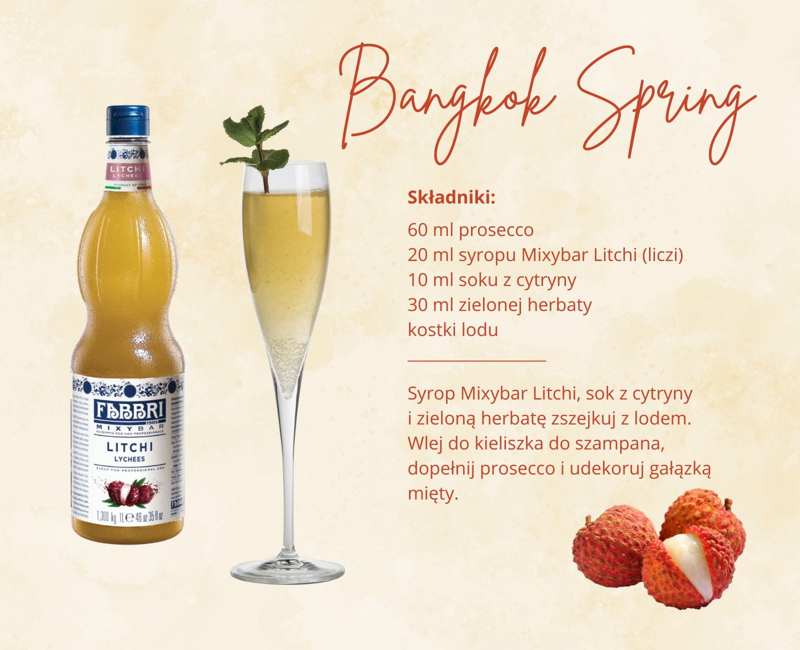 Fabbri Mixybar Litchi to barmański syrop o smaku liczi, który nada Twoim koktajlom, napojom i deserom wyjątkowy smak i aromat świeżego liczi. Bursztynowy wygląd, bogaty w ciepłe refleksy, po rozcieńczeniu przybiera słomkowożółty kolor. Nos jest kwiatowo-owocowy ze słodkimi nutami liczi i egzotycznych owoców. Na podniebieniu słodko, miękko, z dobrze zrównoważonym i trwałym finiszem. Najlepiej komponuje się z sokami owocowymi, mrożonymi herbatami i winami musującymi.