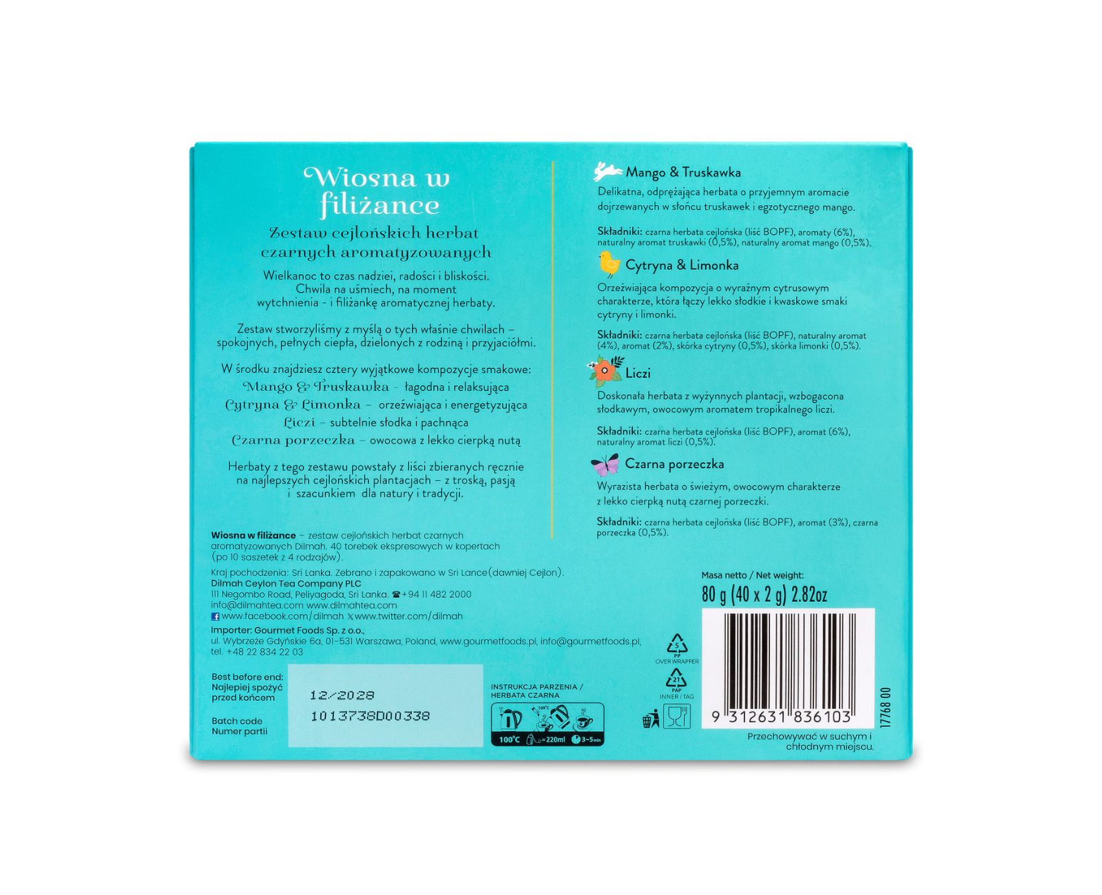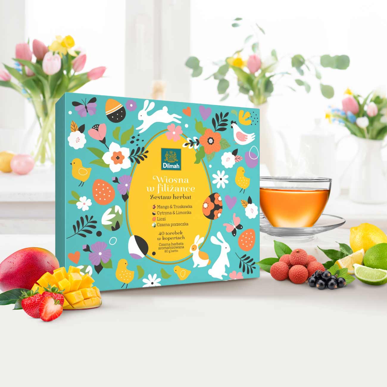 Wielkanocna kolekcja herbat Dilmah "Wiosna w filiżance" to zestaw 40 torebek w kopertach zawierający 4 wyjątkowe smaki: Mango & Truskawka, Cytryna & Limonka, Liczi oraz Czarna porzeczka. Idealny na prezent na Wielkanoc lub do odkrywania nowych smaków herbaty.
