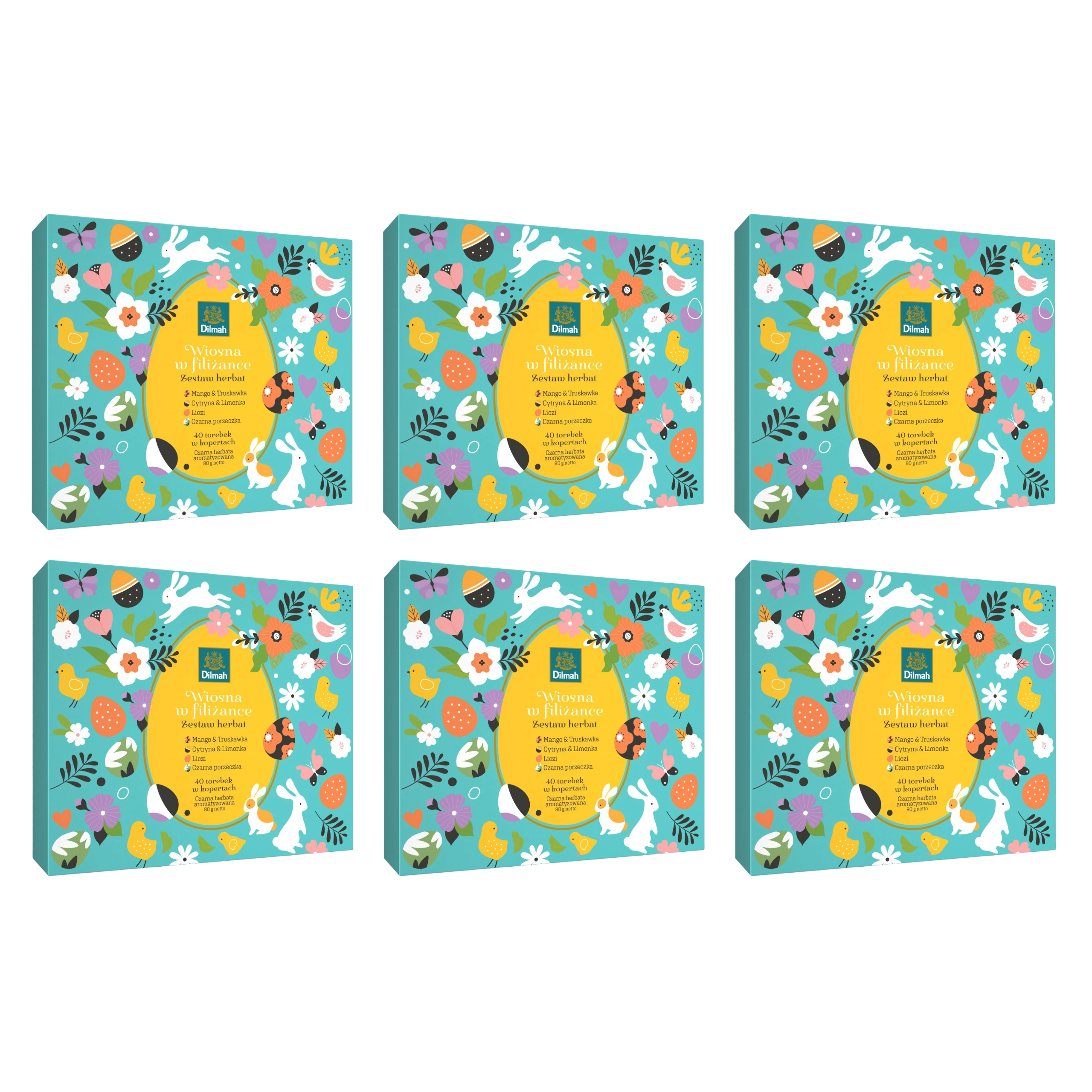 Wielkanocna kolekcja herbat Dilmah "Wiosna w filiżance" to zestaw 40 torebek w kopertach zawierający 4 wyjątkowe smaki: Mango & Truskawka, Cytryna & Limonka, Liczi oraz Czarna porzeczka. Idealny na prezent na Wielkanoc lub do odkrywania nowych smaków herbaty.